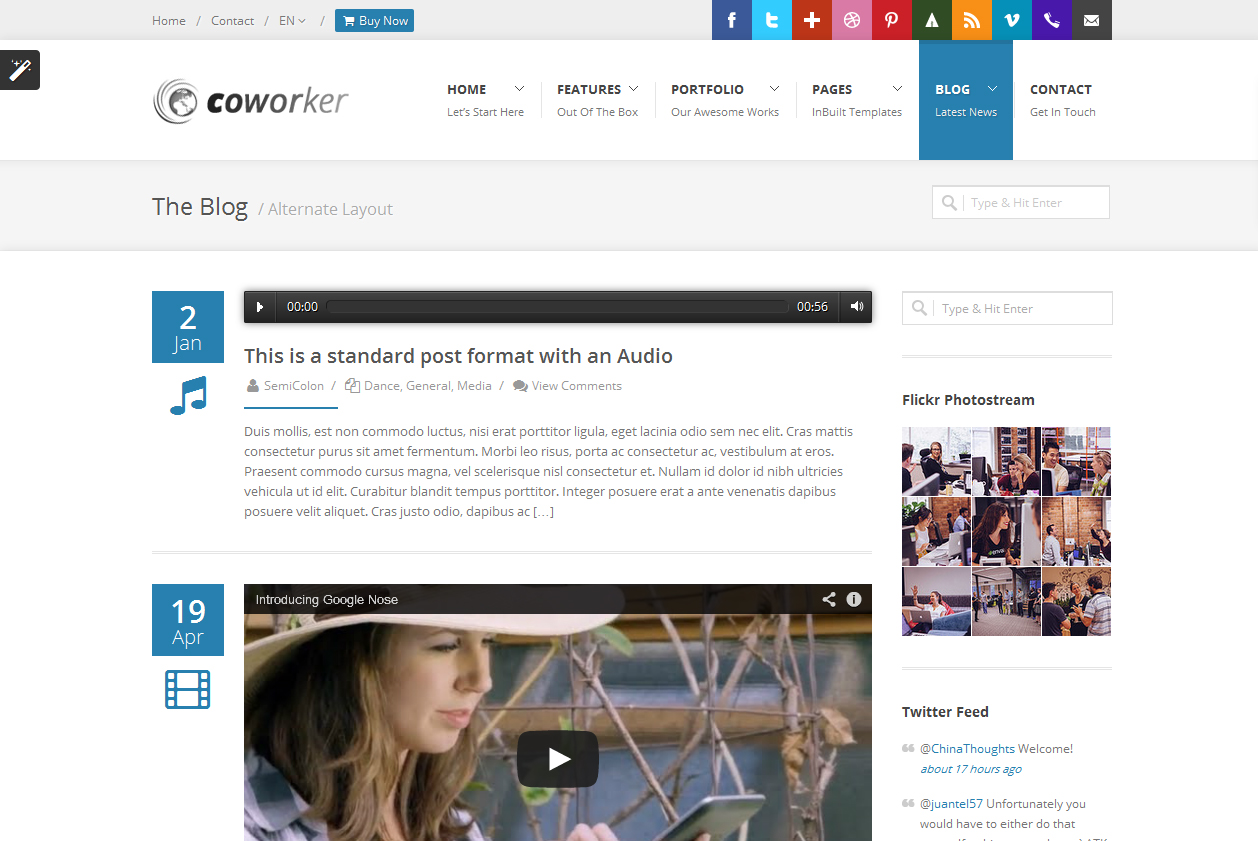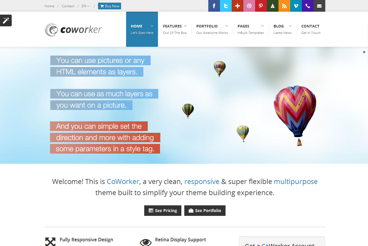 CoWorker é um template WordPress desenvolvido para empresas multiuso. Toneladas de personalizações são possíveis com este tema que vai ajudá-lo a redefinir o valor da marca do seu site.