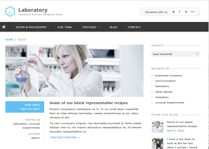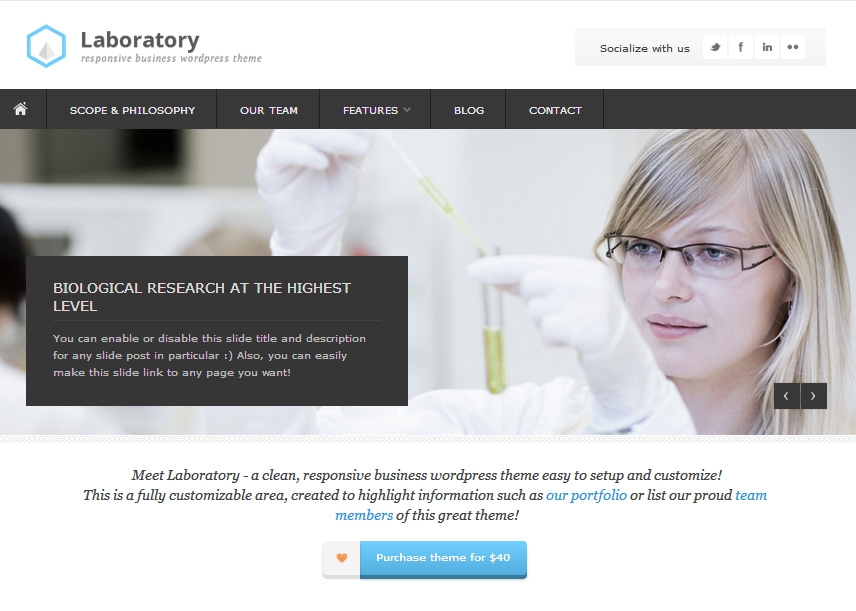 DESCRIÇÃO DO TEMA: Laboratory é um template WordPress desenvolvido para Laboratórios. Totalmente responsive, o layout do tema se adapta muito bem em diversos dispositivos móveis.